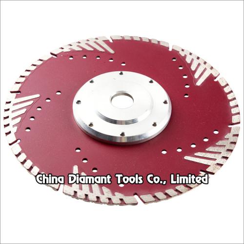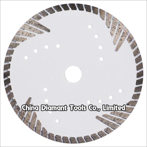 Hot press sintered diamond saw blades with wide turbo rim segments and outspread protective teeth for fast dry cutting various hard, medium, soft stone such as granite, marble, sandstone, limestone, etc. without water or with less water.