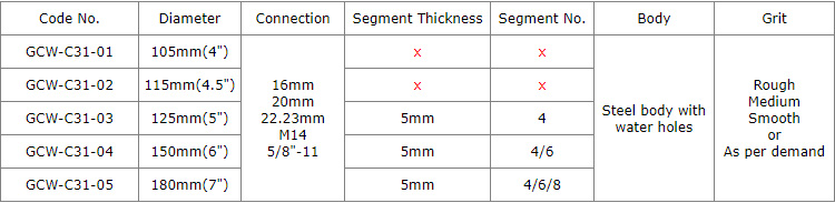 Diamond grinding cup wheels with S shape segments for grinding various concrete or other masonry materials such as stone, terrazzo, bricks, etc., ideal for smoothing and shaping as well as stock removal.