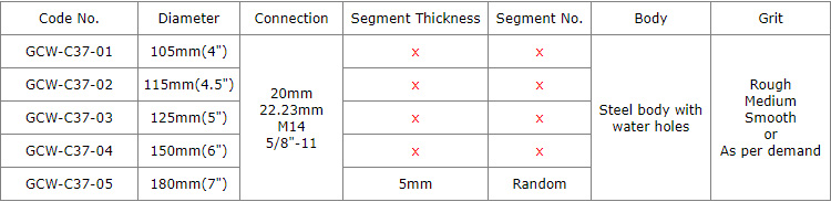 Diamond grinding cup wheels with long & short segments assembled 3 rows for grinding various concrete or other masonry materials such as stone, terrazzo, bricks, etc., ideal for smoothing and shaping as well as stock removal.