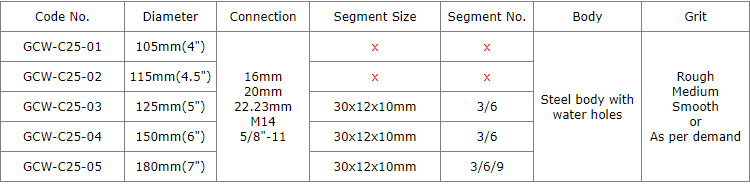This type cup wheels with 9 or 6 or 3pcs big curved segments gives a distinct advantage for speed grinding. Compared to other cup wheels with 5mm thickness segments, these 12 width and 10mm height segments give too much more grinding life.
