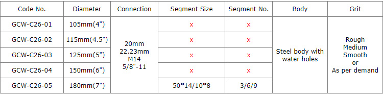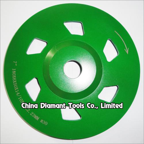 This type cup wheels with with 9 or 6 or 3pcs spiral segments give this cup wheel a distinct advantage when grinding concrete. It is sintered turbo wheels that feature special cooling holes to reduce core heat for optimum performance during aggressive grinding and stock removal.