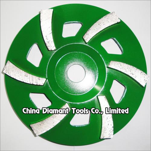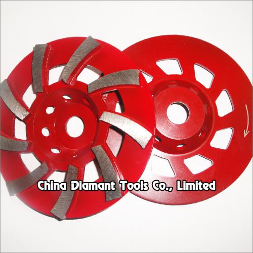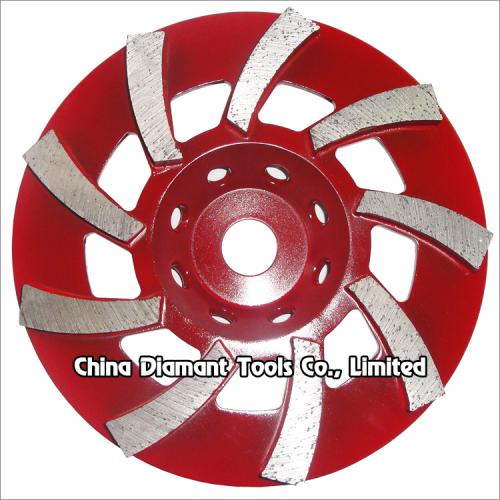 Diamond grinding cup wheels with big spiral segments for grinding various concrete or other masonry materials such as stone, terrazzo, bricks, etc., ideal for smoothing and shaping as well as stock removal.