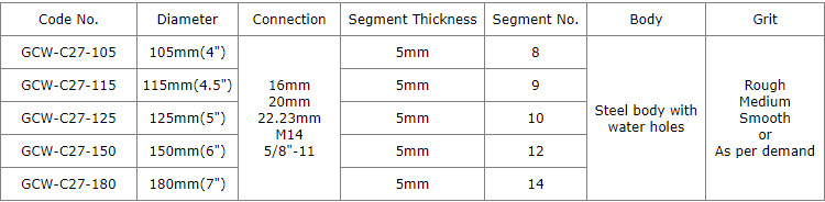 Diamond grinding cup wheels with T shape segments are brazed with a high diamond count for long life grinding various concrete or other masonry materials such as stone, terrazzo, bricks, etc., ideal for smoothing and shaping as well as stock removal, the T segments are specifically engineered to produce a clean, finished surface with fast, smooth grinding action.