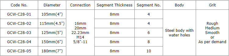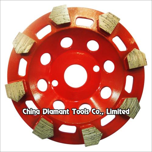 Diamond grinding cup wheels with arrow shape segments for grinding various concrete or other masonry materials such as stone, terrazzo, bricks, etc., ideal for smoothing and shaping as well as stock removal.