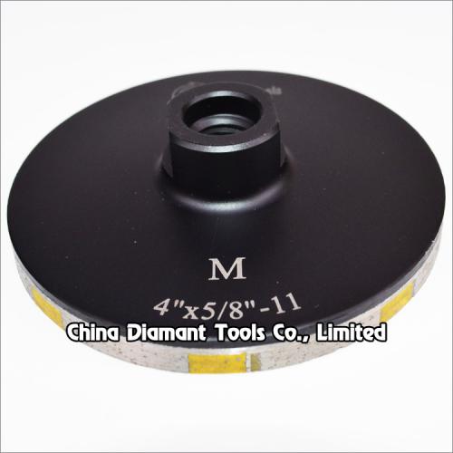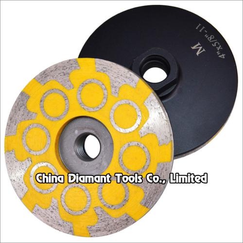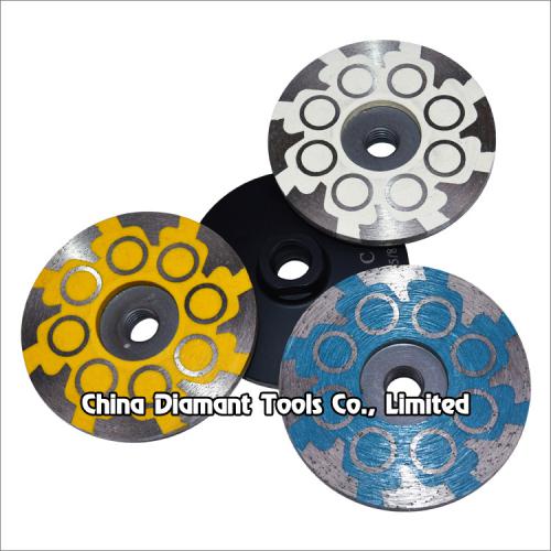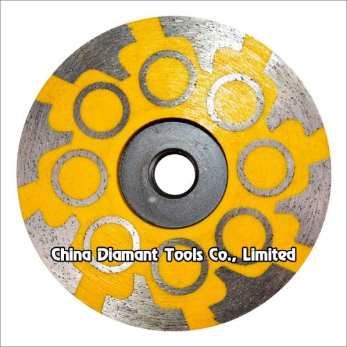 Diamond cup wheels with resin filled metal bond T & cylindrical segments for grinding various stone such as granite marble, sandstone, limestone, artificial stone, etc., ideal for smoothing and shaping as well as stock removal.