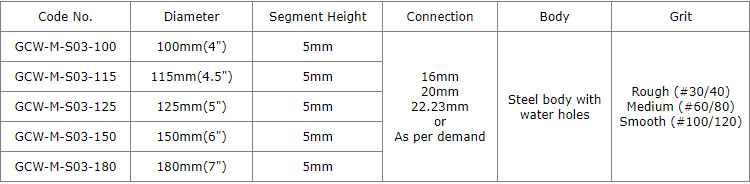 This diamond grinding cup wheels with turbo shape segments generally applicable to the grinding of various stone, marble, granite, ceramic, artificial stone, etc., especially suitable for the building decorated with concrete wall, marble floor, grinding edge of granite plate, chamfering and arc grinding, ideal for smoothing and shaping as well as stock removal.