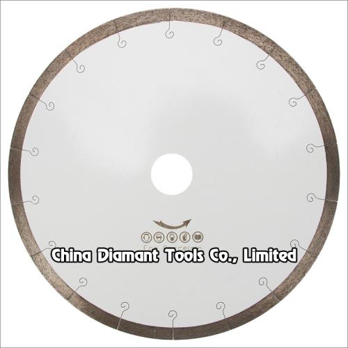 Diamond saw blades continuous rim with laser cut fishhook slot for cutting ceramic, porcelain, tile, masonry, marble, and soft stone, fast cutting speed with less chips.