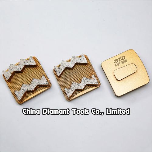 Diamond grinding shoes floor grinding pads with 1 or 2pcs metal bond mountain shape segments for redi-lock holder of Husqvarna grinders, they are often used for rough leveling and grinding of concrete/terrazzo/stone floor, such as underground parking lot, factory floor, etc., to remove the attachment on its surface.