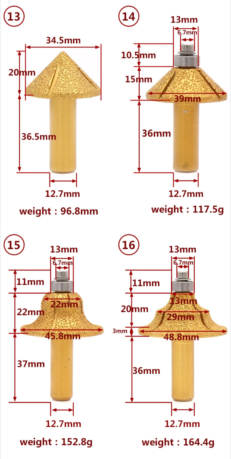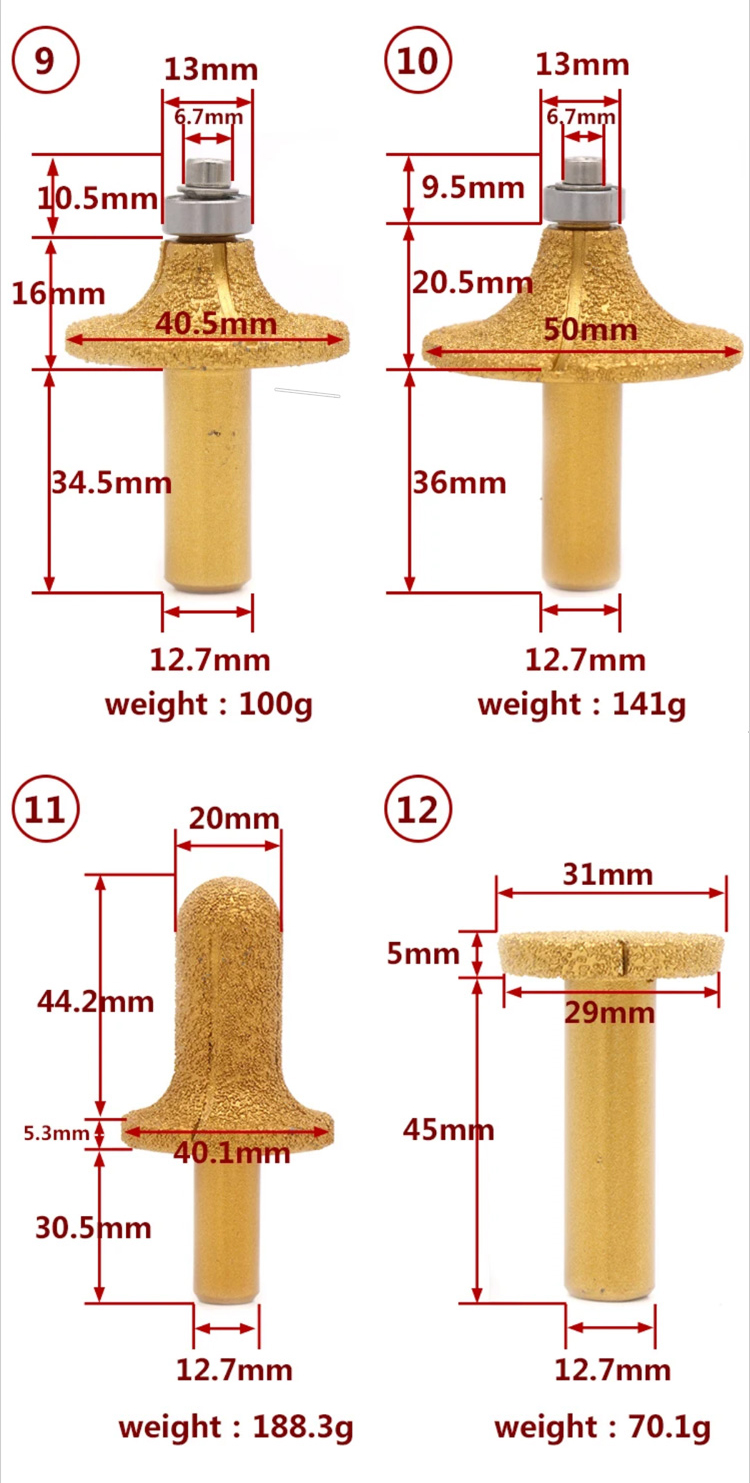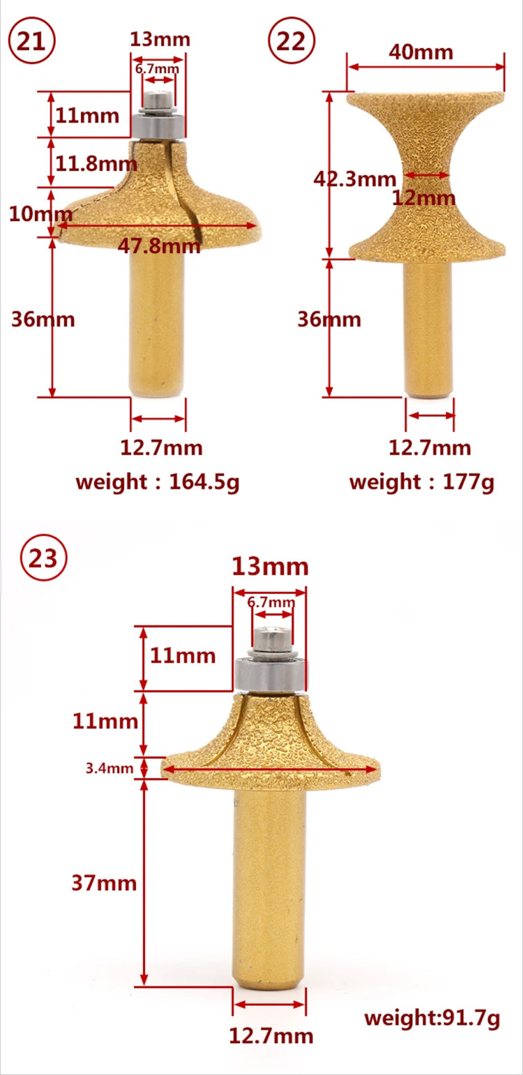 Diamond router bits with 1/2" shank are mainly used for shaping the edge or curve line for various granite marble stone ceramic on angle grinder or CNC profile machine.