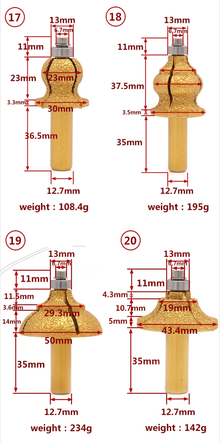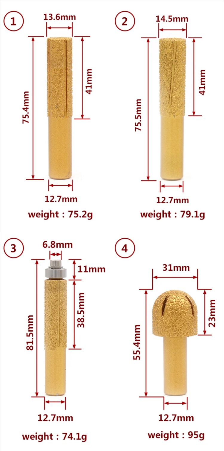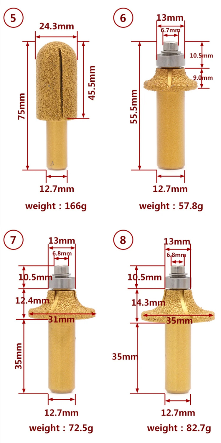 Diamond router bits with 1/2" shank are mainly used for shaping the edge or curve line for various granite marble stone ceramic on angle grinder or CNC profile machine.