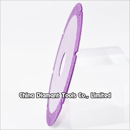 This type vacuum brazed diamond saw blades are specially designed for cutting sintered stone which is a very hard artificial stone with the Mons' hardness scale between 6-7, also it is suitable for smooth cutting, glass, jade, crystal, wine bottles, marble, ceramics, concrete and similar materials.